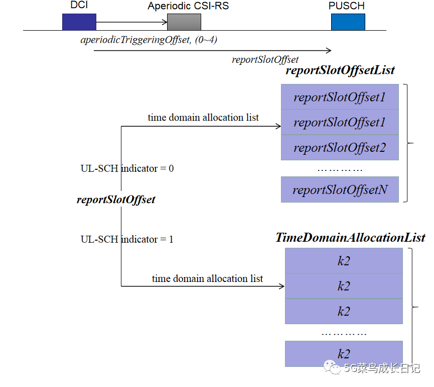 如果DCI中的UL-SCH indicator为0时候,这个时候PUSCH只承载的是非周期CSI,并不发送UL-SCH,使用DCI中的time domain allocation list field来索引reportSlotOffsetList获取对应的reportSlotOffset。