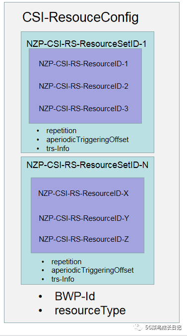 CSI-ResouceConfig,包含了标识CSI-ResourceConfigId,若干组NZP-CSI-RS-ResourceSet,以及若干组用于Beam Management和Report的SSB配置。