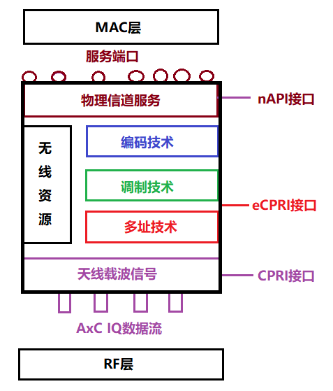 (1)nFAPI: 物理层PHY_High与MAC的接口, 并以物理信道的形式向MAC层提供服务。