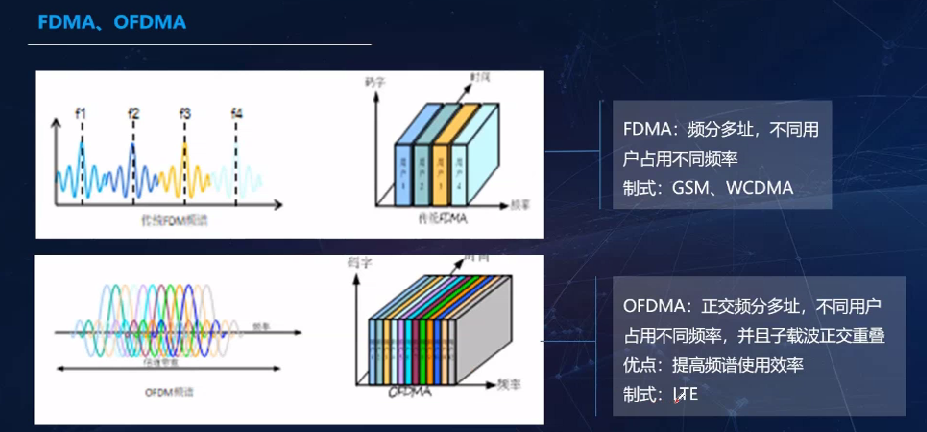 - 频分多址FDMA:通通过同一时间的不同载波频率承载不同用户的数据,实现多用户共享一个波段的无线资源。
