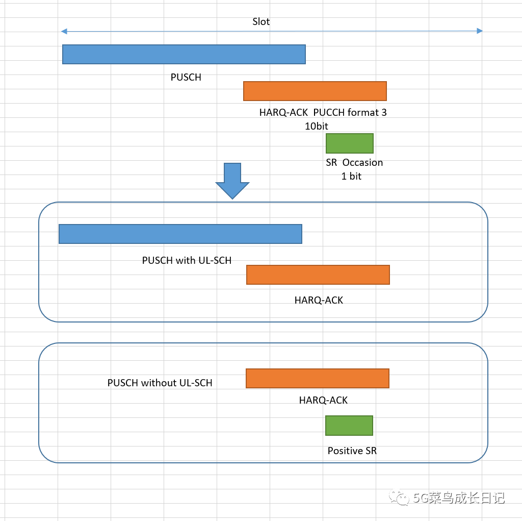 1)如果PUSCH中包含UL-SCH,先处理PUSCH和SR(无论是Positive SR还是Negative SR)之间的冲突,那么可以先把SR给丢弃,保留PUSCH和HARQ-ACK,最后HARQ-ACK复用到PUSCH上发送。