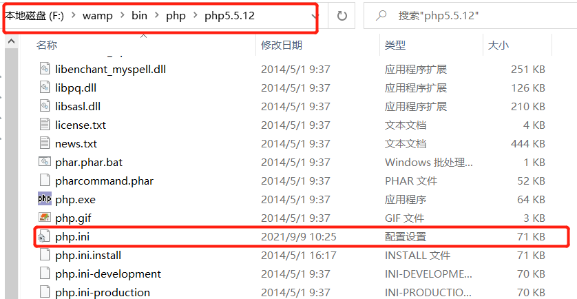 step 1:找到F:wampbinphpphp5.5.12,找到这个目录下的php.ini文件(小伙伴们根据你们自己的安装路径找哈),用编辑器打开。