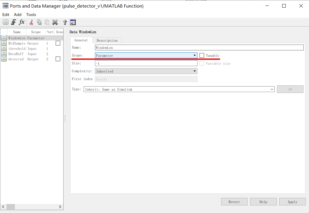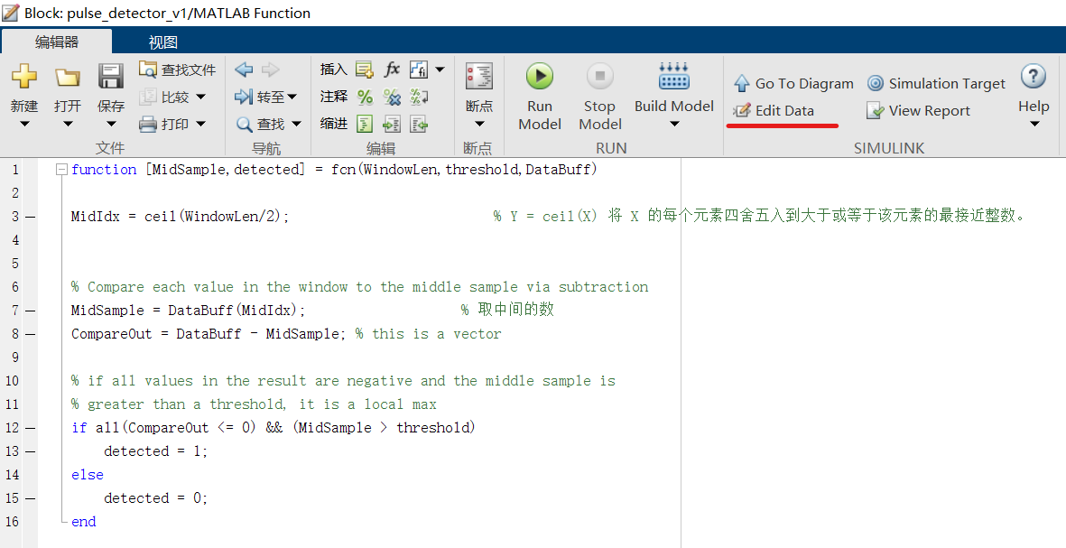 使用MATLAB Function block完成剩下的硬件友好峰值检测算法,从pulse_detector_reference.mlx中粘贴代码到这个block,如下截图所示。点击下图所示的Edit Data按钮取消勾选Windowlen可调选项