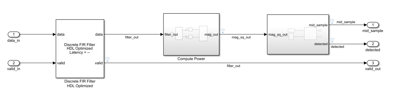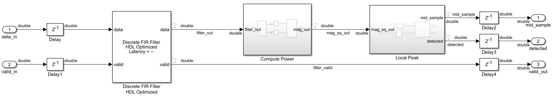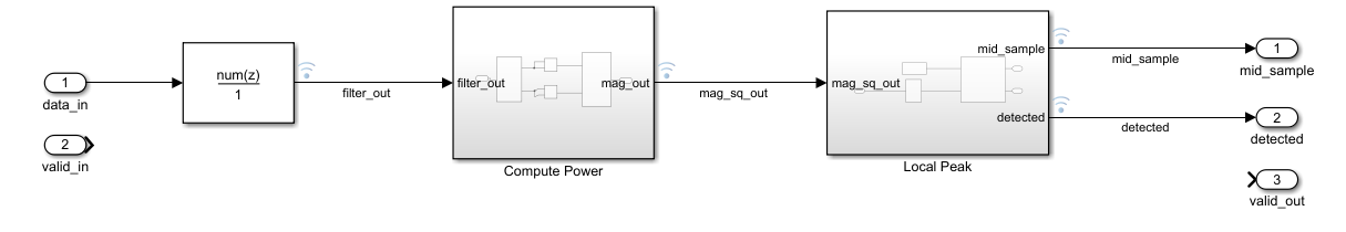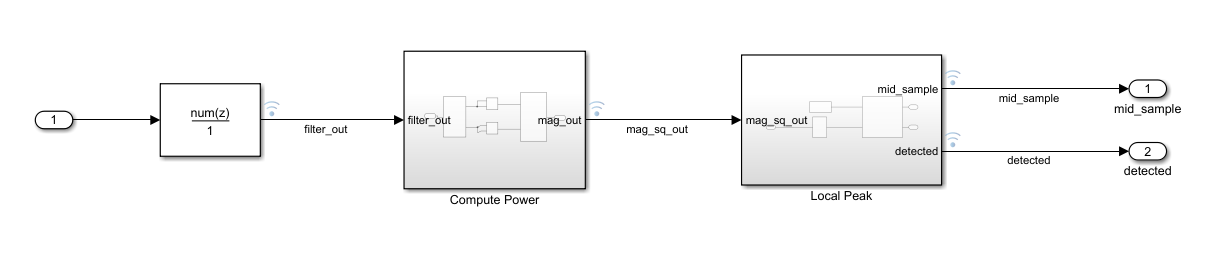 打包滤波模块( the filter block,)、功率计算模块(the Compute Power)、峰值子系统(Local Peak)子系统作为顶层子系统命名为Pulse Detector这个顶层子系统就是要产生HDL代码的部分