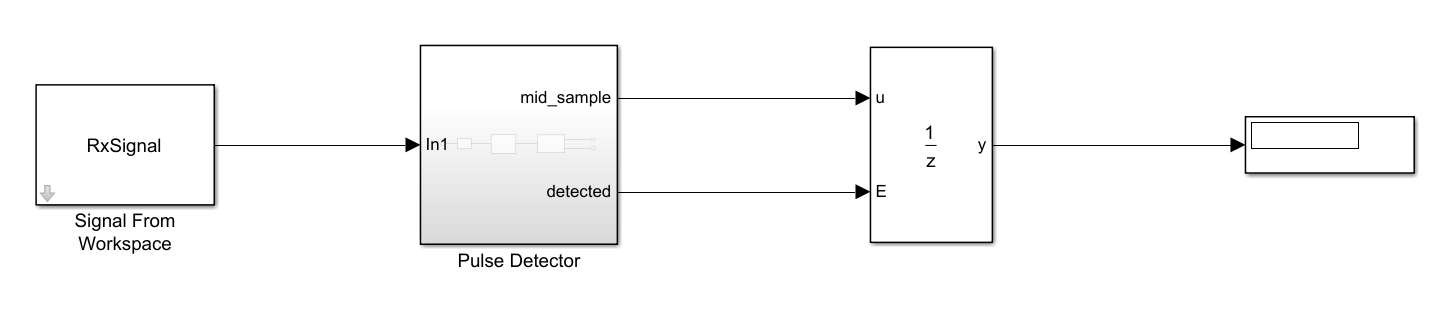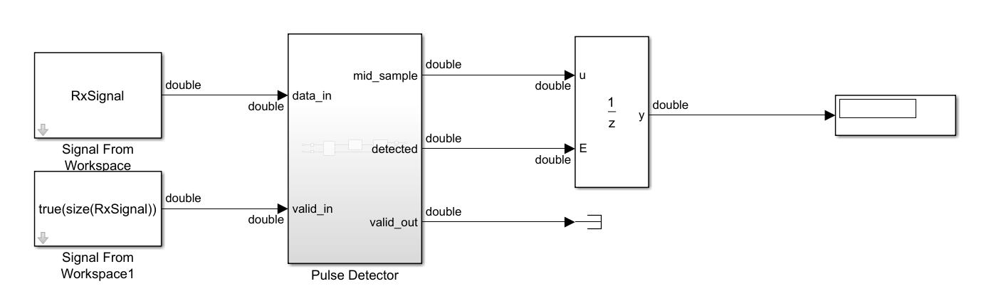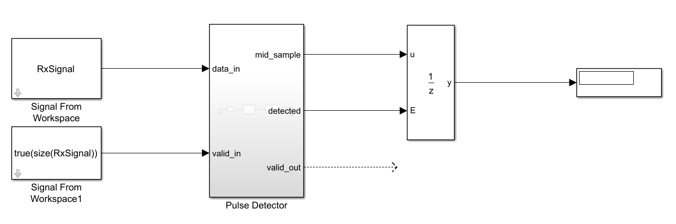 从Signal From Workspace 模块中添加一个输入有效的信号并且在信号栏输入 true(size(RxSignal)),该信号作为Pulse Detector子系统的第二输入
