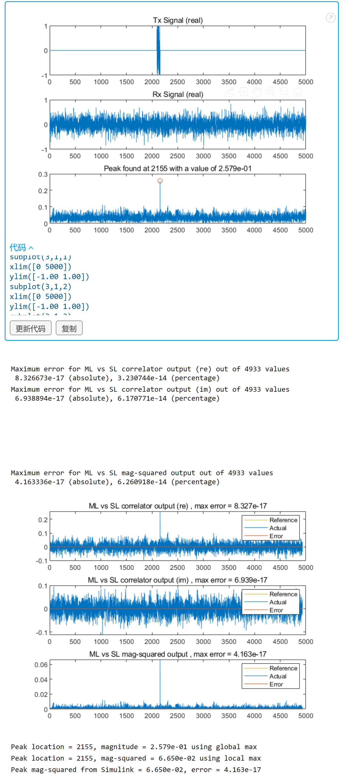 % Simulate model and compare results to reference if iscolumn(CorrFilter) % 确定输入是否为列向量 CorrFilter = transpose(CorrFilter); % need row vector for filter block end SimTime = length(RxSignal) + WindowLen; % Simulate model slout = sim('pulse_detector_v1'); % simOut = sim(model) 使用现有模型配置参数对指定模型进行仿真,并将结果返回为 Simulink.SimulationOutput 对象 % Correlation filter output FilterOutSL = getLogged(slout,'filter_out'); compareData(real(FilterOut),real(FilterOutSL),{2 3 1},'ML vs SL correlator output (re)'); compareData(imag(FilterOut),imag(FilterOutSL),{2 3 2},'ML vs SL correlator output (im)'); % 运行到此处 % Magnitude squared output MagSqSL = getLogged(slout,'mag_sq_out'); % Get the object a signal interface element compareData(MagSqOut,MagSqSL,{2 3 3},'ML vs SL mag-squared output'); % Peak value MidSampleSL = getLogged(slout,'mid_sample'); Detected = getLogged(slout,'detected'); PeakSL = MidSampleSL(Detected>0); fprintf('nPeak location = %d, magnitude = %.3d using global maxn',location,peak); fprintf('Peak location = %d, mag-squared = %.3d using local maxn',location_2,peak_2); fprintf('Peak mag-squared from Simulink = %.3d, error = %.3dn',PeakSL,abs(peak_2-PeakSL)); % % Copyright 2020 The MathWorks, Inc. % function signal_val = getLogged(simout_obj,signal_name) logsout = simout_obj.logsout; if isempty(logsout) error('No logged signal found. Make sure ''%s'' is logged in the model',... signal_name); end sig = logsout.getElement(signal_name); if isempty(sig) error('Signal ''%s'' not found. Make sure it is logged and named correctly.',... signal_name); end signal_val = squeeze(sig.Values.Data); endimage-20200626101926772