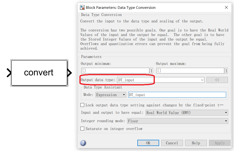 顶层模块添加一个Data Type Conversion转换模块在RxSignal信号后,设置输出的数据类型为DT_input,DT_input在测试脚本中被定义为fixdt(1,16,14) 代表-1到1中的数