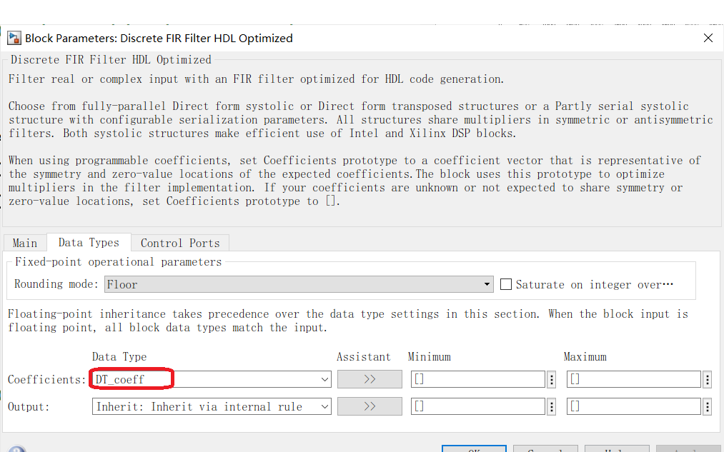改变滤波器的系数为DT_coeff,DT_coeff被定义为fixdt(1,18),常量的分数长度未被指定时可以自动确定