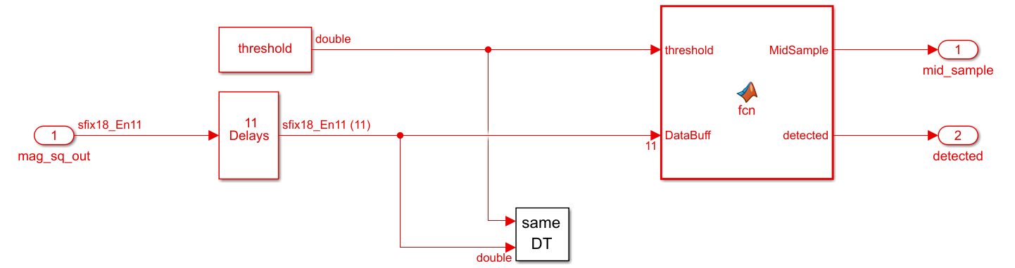 连接constant, tapped delay and MATLAB function blocks,封装这三个模块作为一个子系统并命名为Local Peak,并将输出信号命名为mid_sample和detected并使能数据日志