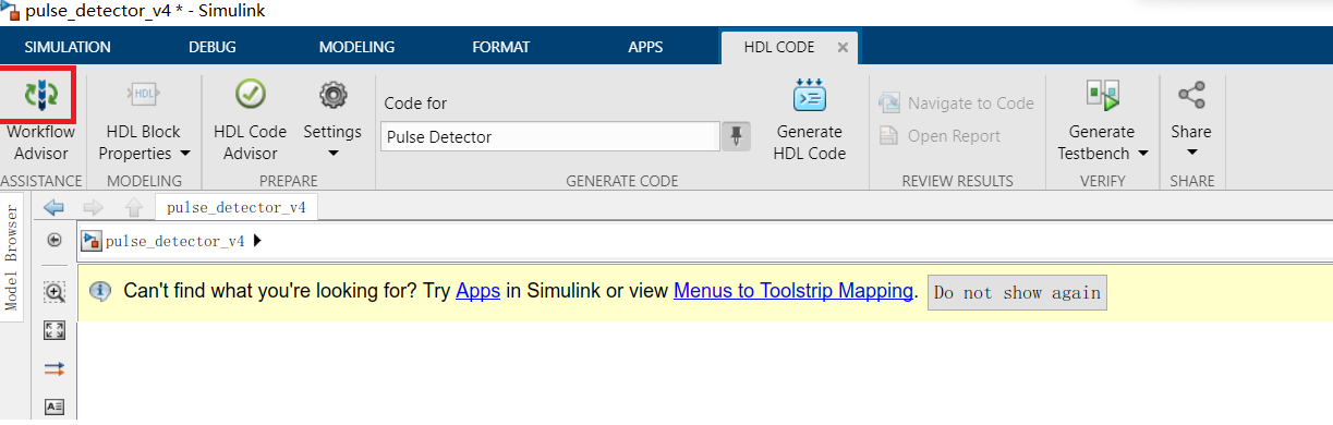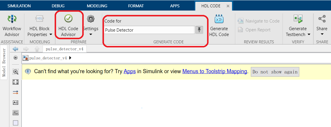 设置顶层子系统Pulse Detector为DUT(HDL Code Toolstrip > unpin > click on subsystem