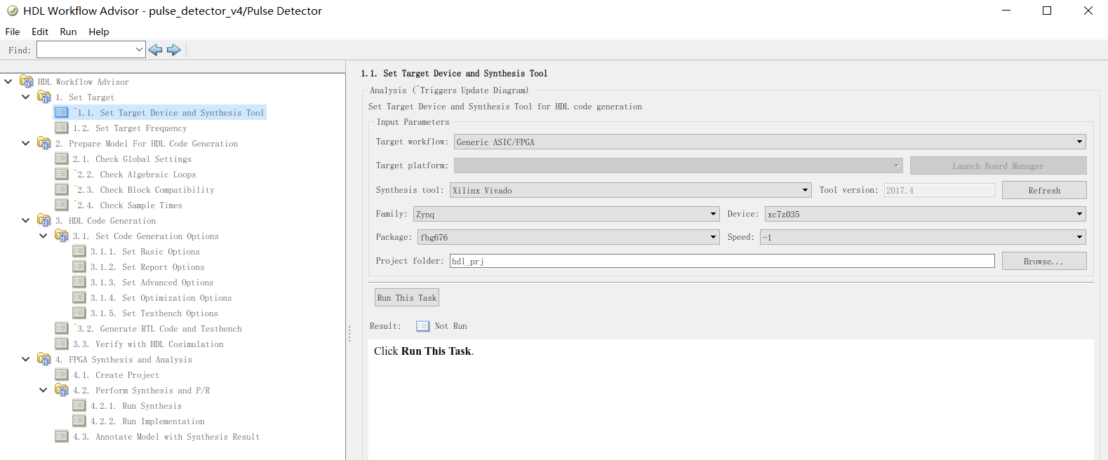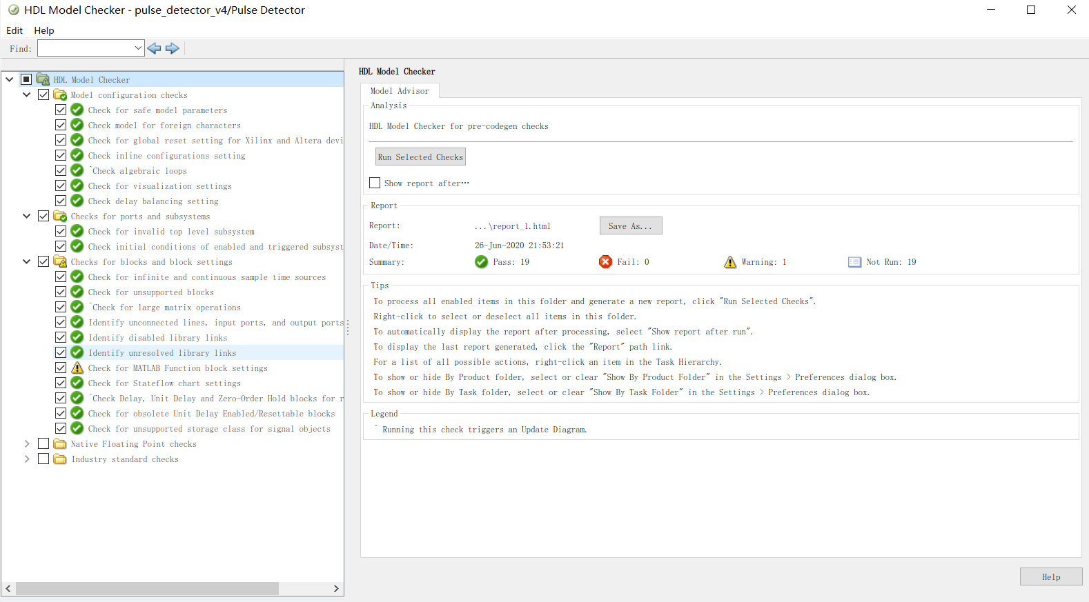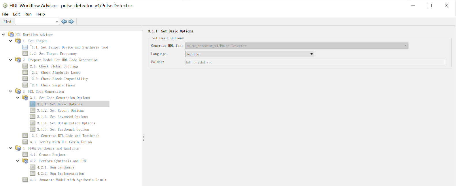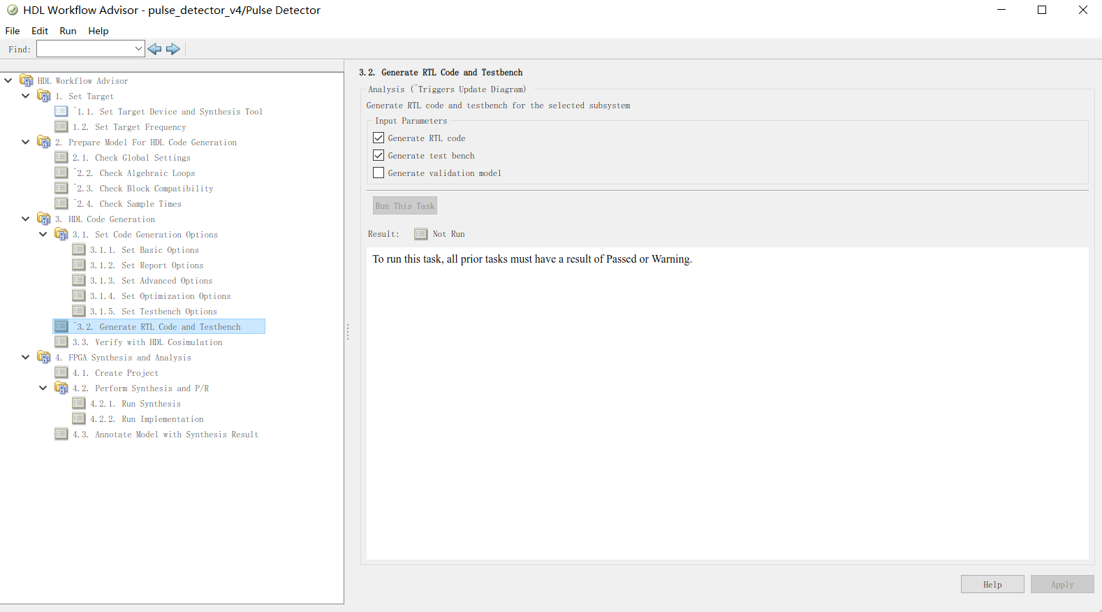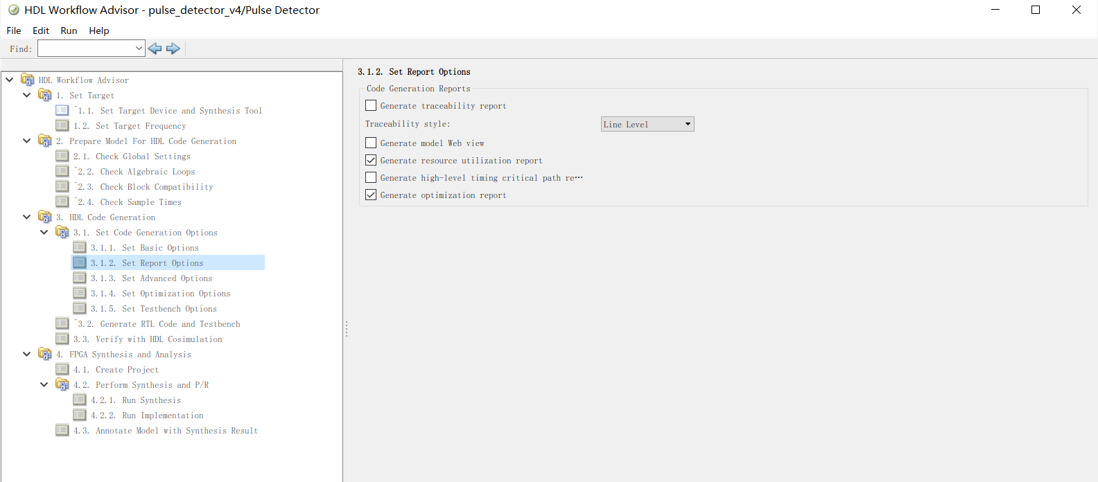 执行MATLAB命令hdlsetup(‘pulse_detector_v2’),配置模型设置兼容HDL代码生成
