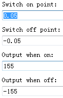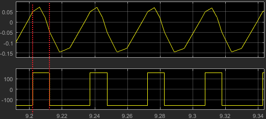 当结果大于0.05,输出155。当结果小于-0.05,输出-155。即当电流采样值小于电流参考值,超过下限0.05时,输出155,让相电流上升。当电流采样值比参考值大0.05时,输出-155,让相电流下降。