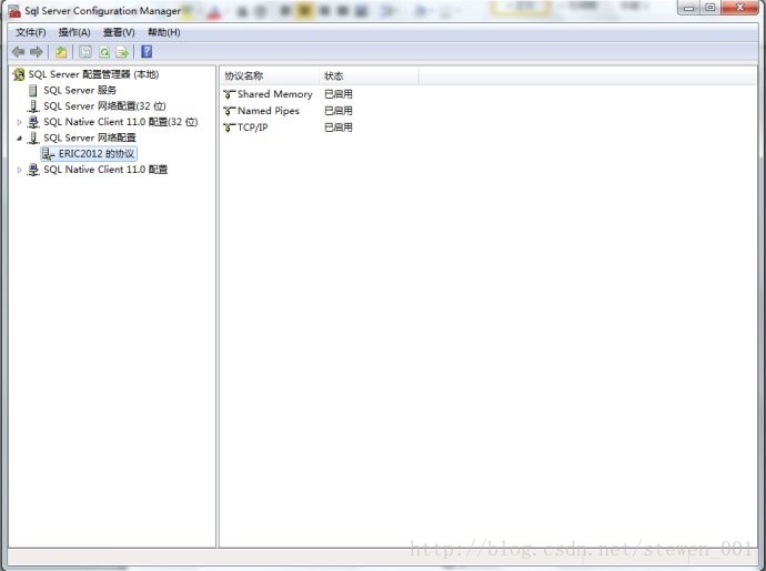 2、打开的窗口如下图所示。在左边栏找到 SQL Server网络配置选项,点开它的小箭头,会看到“【你的数据库名】的协议” (图中是ERIC2012的协议),选中它,看右边栏。如下图2所示: