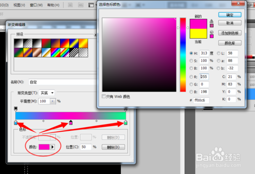 接下来,点击工具栏的渐变工具,设置渐变颜色值为3色过渡,我这里随意选择的,大家可以按照自己喜欢的颜色设置。