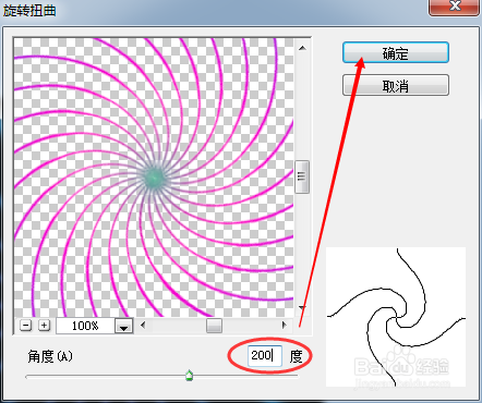 执行菜单命令【滤镜】-扭曲-旋转扭曲命令,设置参数值为200,点击确定后效果如图。