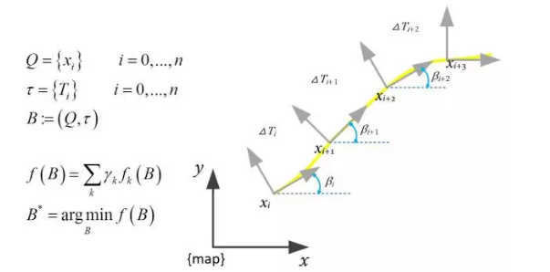 时间弹性带(TEB)简而言之,就是连接起始、目标点,并让这个路径可以变形,变形的条件就是将所有约束当做橡皮筋的外力。起始点、目标点状态由用户/全局规划器指定,中间插入N个控制橡皮筋形状的控制点(机器人姿态),当然,为了显示轨迹的运动学信息,我们在点与点之间定义运动时间Time。