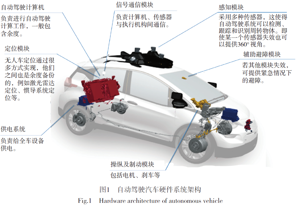 自动驾驶系统一般是在传统汽车上进行加装来构建整个系统。下面引用通用汽车公司的Cruise自动驾驶汽车的硬件系统架构[7](图1)进行介绍,其他公司方案类似[8-9]。从图1 中可以清晰地看出,自动驾驶硬件系统主要包含五部分:感知模块、自动驾驶计算机、供电模块、信号通信模块、执行和制动模块。