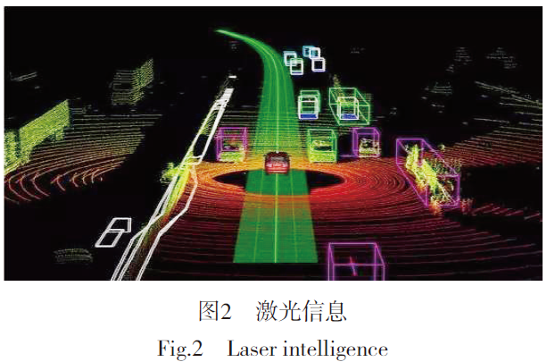 激光雷达用于获取激光扫描反射数据,用于识别行人、车、树等障碍物,进行定位等。其三维测距原理是通过测量激光信号的时间差、相位差确定距离,通过水平旋转扫描测角度,并根据这两个数据建立二维的极坐标系,再通过获取不同俯仰角度的信号获得第三维的高度信息。图2 为激光获取的数据信息经过识别分类标注不同颜色处理后得到的图。