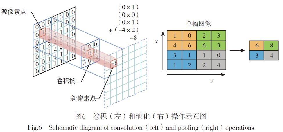 卷积神经网络由一个或多个卷积层和全连接层(对应经典的神经网络,可有可无)组成,卷积层执行的计算包含卷积操作和池化操作。卷积计算是通过不同窗口数据和滤波矩阵(一组固定的权重)做内积(逐个元素相乘再求和)的操作得到卷积后的数据;池化计算将数据分块,每块找最大或求平均作为数据块的代表值。具体操作示意图见图6。