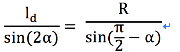 Pure pursuit方法的依据是使如上图所示的单车模型以合适的前轮转向 δ 运动,并恰好使无人车后轴中心经过当前的路点。 这样一来,我们就可以根据当前的路点以及单车几何模型计算当前的期望前轮转向角 δ。那么更具正弦定理我们可以推导出如下转换式: