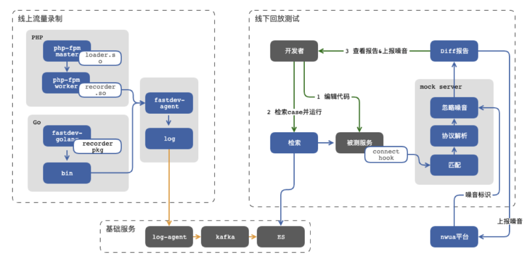 当我们的微服务数已经达到了四位数的时候,All in one模式早已不能支撑测试需求,所以我们开始探索其他解决方案。我们把目光转移到了UT上,它最大的优势就是下游依赖全部通过mock的方式替换掉,只需部署被测服务即可。常见的类似方案还有契约测试,常用工具是Pact。契约测试认为在微服务架构下E2E测试其实是一个伪需求,应该按照契约分别测试Consumer和Provider。我们也一度认为微服务下的测试可能真的不适合做E2E测试,但当真正应用的时候,我们发现Pact测试太理想化了,如果针对下游依赖很少的服务来说还行(但我们觉得All in one模式可能比Pact还好用),但对于最上游依赖成百上千个服务,场景复杂多变的服务来说,Pact维护成本可能比环境维护成本还大(这里我们不讨论架构设计的合理性,只讨论现状)。但Pact测试还是给了我们一些启发,如果我们能解决自动生成契约的方式,似乎问题就解决了。所以从17年开始我们尝试通过线上录制流量,线下回放流量的方式验证了可行性,随后在滴滴内部逐渐推广开来,我们内部管它叫Fastdev,同时对外分别开源了针对PHP的https://github.com/didi/rdebug和针对Go的https://github.com/didi/sharingan,设计思路如下