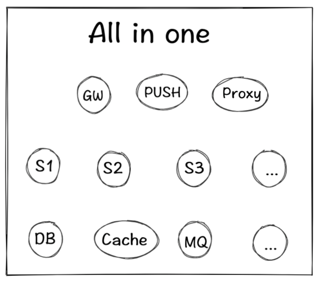 在滴滴微服务落地初期,一个业务涉及服务数并不会太多,最多也就十几个,在这种场景下,不管怎么搭建测试环境都是相对容易的,哪怕是手动维护也耗费不了多少成本,所以在这个时期我们通过工具自动构建所有服务,把所有服务都打包在一起基本就够用了,我们管它叫"All in one"环境。这种方式持续了很长时间,直到现在依然支持着部分测试工作,但随着微服务数的增多这种方式越来越难以维护。
