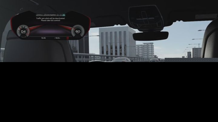 当系统检测到车速超过60km/h后,此时已脱离拥堵路段。Audi AI会有8~10秒的缓冲时间,提示驾驶员接管汽车。若10秒后驾驶员依旧未接管汽车,系统处于安全的考虑,会缓慢减速,直到停止,并打开双闪灯。