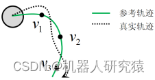 轨迹规划相当于局部路径规划的细化过程,如图11-26所示。局部路径只考虑了几何约束,而在局部路径上添加运动学约束和动力学约束后就生成了机器人实际能执行的轨迹,这就是所谓的轨迹规划。理想情况下,可以直接取轨迹规划中的各个轨迹点速度信息做为动作量直接输入到执行器(也就是电机)。不过电机控制误差、路面起伏、轮胎打滑等因素,导致这种开环控制策略很难奏效。