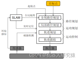 机器人自主导航涉及SLAM、路径规划、运动控制、环境感知等核心技术,这些技术的大致关系如图11-24所示。其实自主导航问题的本质就是图11-1所描述的那3个问题,首先要知道机器人在哪,然后要知道机器人需要到达的目标在哪,最后就是寻找路径并利用控制策略开始导航。关于目标点,由人或者特定程序触发(比如人通过点击地图上的某个点来告诉机器人应该去哪里;或者语音交互程序接收到某条语音控制指令,然后语音控制指令被转换成地图中的相应目标点发送给机器人;或者某些特殊条件触发目标点,例如机器人电量低时充电桩目标点自动发送给机器人)。总之,对于自主导航来说目标点为外部给定的一个已知量。关于起始点,有SLAM定位模块提供。关于寻路和控制策略则比较复杂,包括全局路径规划、局部路径规划、轨迹规划、轨迹跟踪等过程。