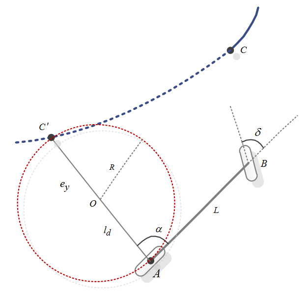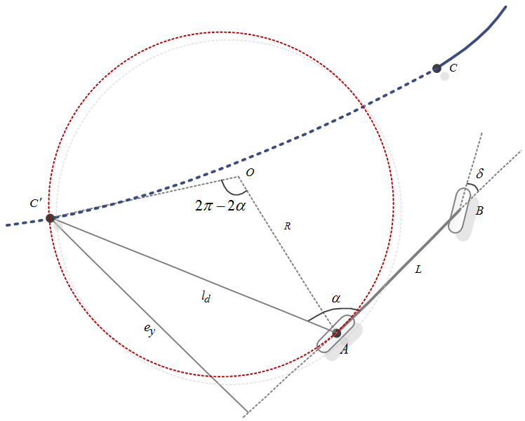 如果预瞄点如下图所示,那么????大于90度,车辆后轮的运行轨迹应该是大圆,绕了一个大圈,是在向后跟踪,此时的前轮转角计算公式仍然不变。