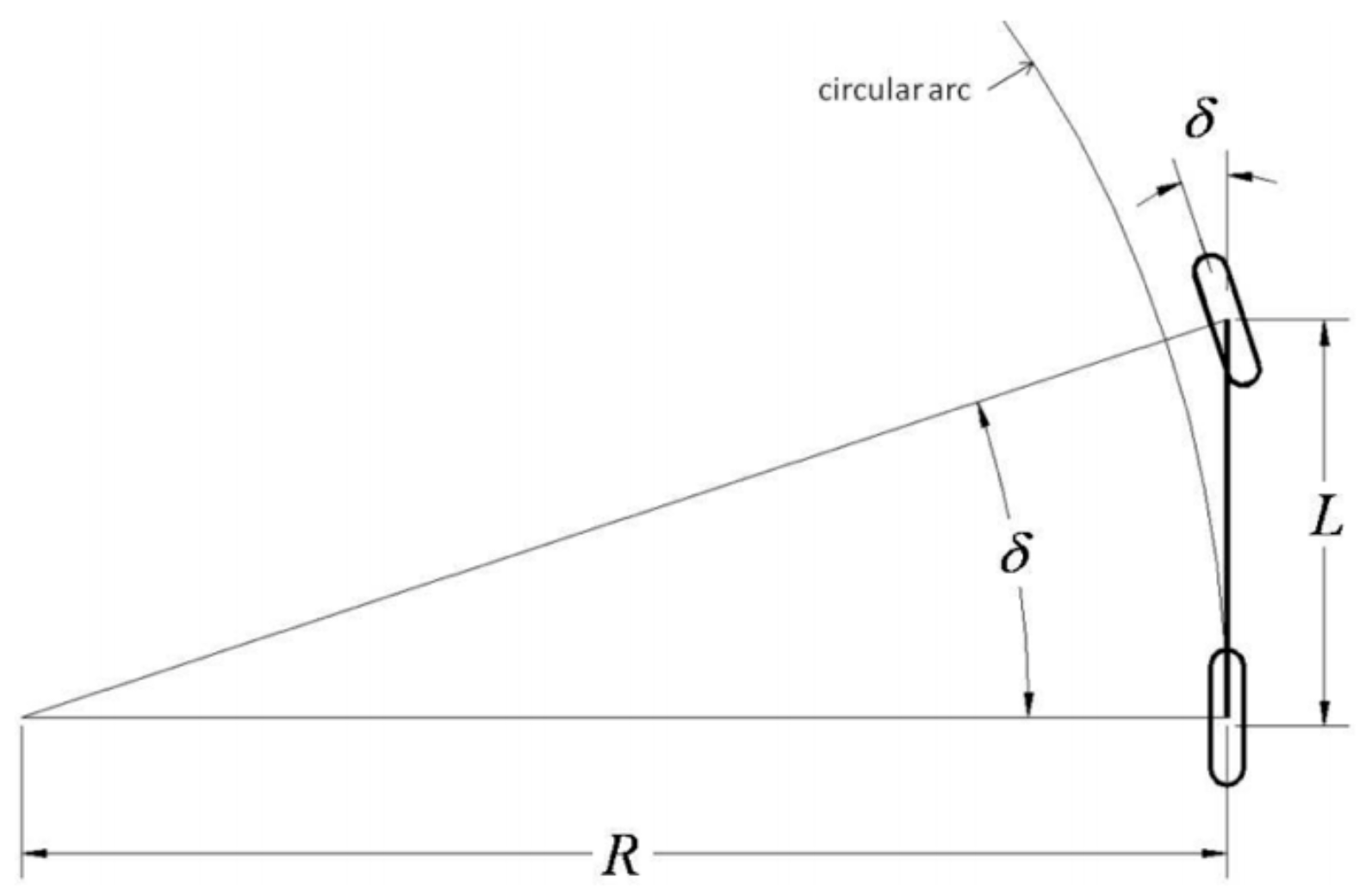 自行车模型 其中 δ 表示前轮的转角,L 为轴距(Wheelbase),R则为在给定的转向角下后轴遵循着的圆的半径。这个公式能够在较低速度的场景下对车辆运动做估计。