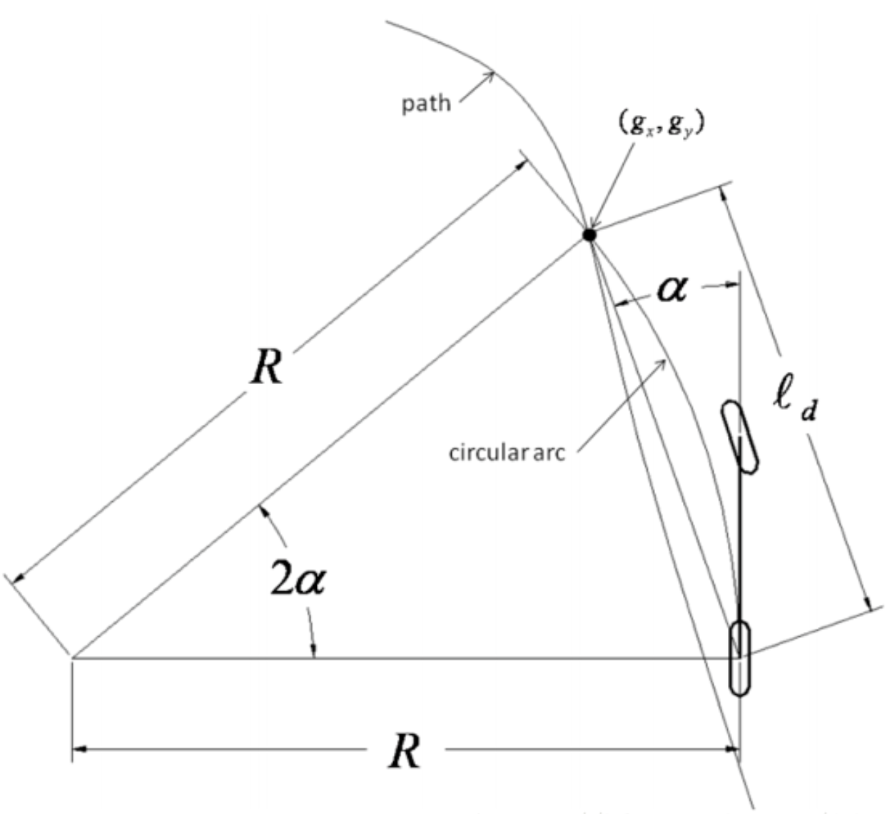 从自行车模型出发,纯跟踪算法以车后轴为切点, 车辆纵向车身为切线, 通过控制前轮转角,使车辆可以沿着一条经过目标路点(goal point)的圆弧行驶,如下图所示