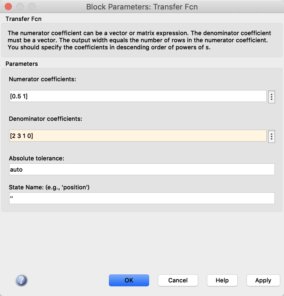 Transfer Fcn模块:实现系统前向通道的函数传递,参数设置如下所示。