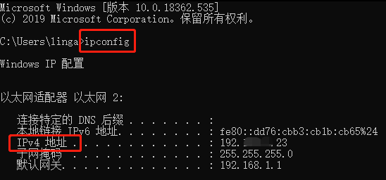 Windows系统下:查看IP地址。