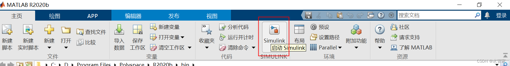 (2) 单击MATLAB主页选项中的Simulink打开。