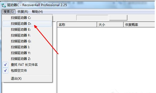 2、搜索你想恢复的磁盘,就是你所删除的文件曾经在哪个驱动器内,就选择这个磁盘的盘符。如果你在D盘中误删除了文件,就点击D盘,点击之后开始搜索所有在D盘中曾经删除的文件。