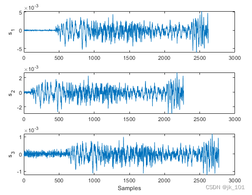 信号s1落后于s2,但领先于 s3。可以使用finddelay精确计算延迟。可以看到,s2 领先于 s1 350 个样本,s3落后于 s1 150 个样本,而 s2 领先于 s3 500 个样本。