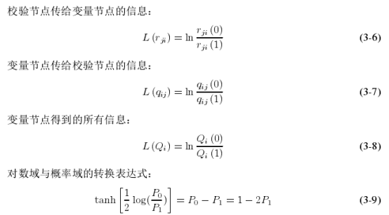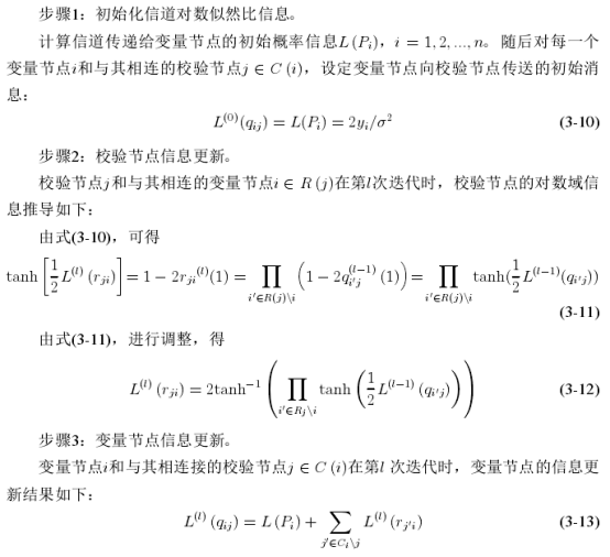 置信传播(BP)译码算法,置信传播算法是基于Tanner图的迭代译码算法。在迭代过程中,可靠性消息,即“消息”通过Tanner图上的边在变量节点和校验节点中来回传递,经多次迭代后趋于稳定值,然后据此进行最佳判决,BP译码算法有着非常好的译码性能。