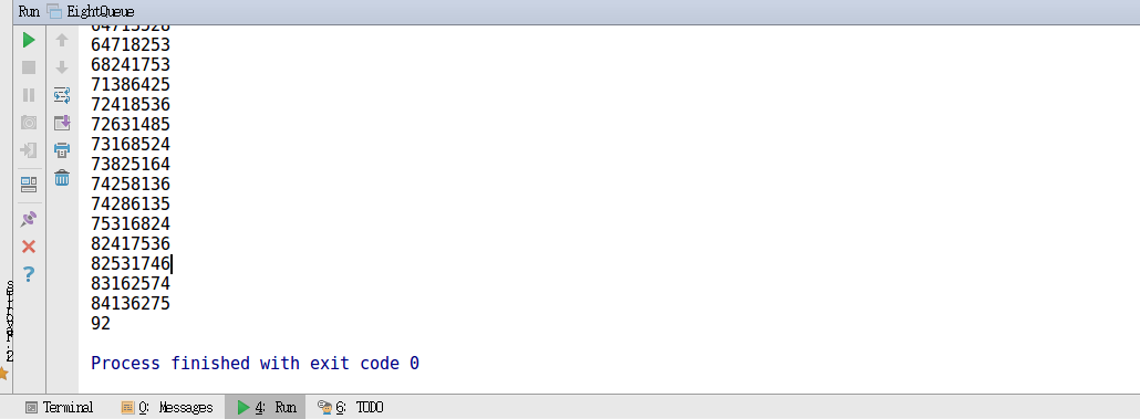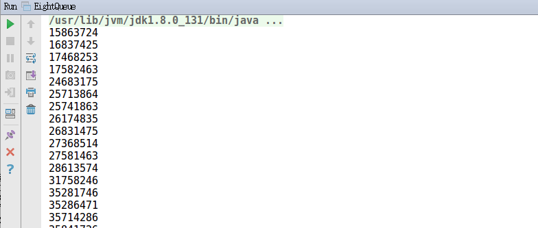 import static java.lang.Math.abs; public class EightQueue { int[] x = new int[9]; static int sum = 0; public void queue(int n){ int i,k; for(i=1;i<=n;i++){ x[i]=0; } k=1; while(k>=1){ //如果回溯完,则k=0,循环结束。 x[k]=x[k]+1; //在下一列放置第k个皇后 while(x[k]<=n&&!place(k)){ x[k]=x[k]+1;//搜索下一列 } if(x[k]<=n&&k==n){//得到一个输出 sum++; for(i=1;i<=n;i++){ System.out.print(x[i]); } System.out.println(); }else if(x[k]<=n&&k<n){ k=k+1;//放置下一个皇后 }else { x[k]=0;//重置x[k],回溯 从第0列开始 k=k-1; } } } boolean place(int k)//考察皇后k放置在x[k]列是否发生冲突 { int i; for(i=1;i<k;i++) //i表示前1到k-1的每个棋子的比较 if(x[k]==x[i]||abs(k-i)==abs(x[k]-x[i])) return false; return true; } public static void main(String[] args) { int n= 8; EightQueue eightQueue = new EightQueue(); eightQueue.queue(n); System.out.println(sum); } }