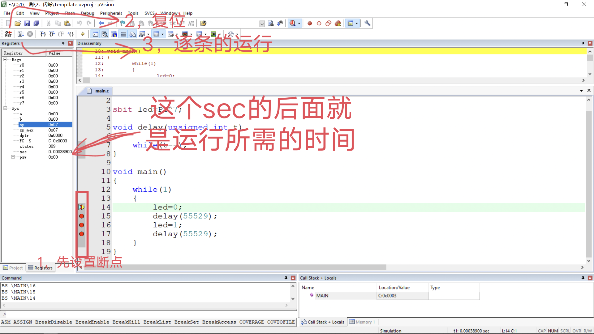 简单来说就是,在主函数里调用写好的延时函数,达到延时的目的。 下面用单片机LED的闪烁实验举例: