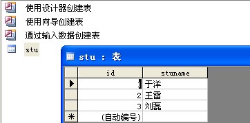 1. 在站点(我的站点为:E:\javatest)下建立文件夹“AccessDb”并在文件夹下建立数据库“test.mdb”以及表“stu”,stu字段为 id,stuname test.mdb所在路径为:E:\javatest\AccessDb 下面