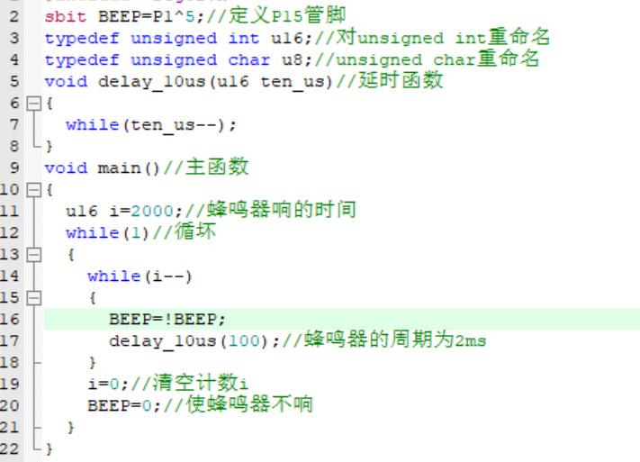 如果想要不同的音色可以修改周期,想要声音时间久一点,就修改计数i的值,想要声音大一点可以修改占空比(一个周期内高电平所占时间)