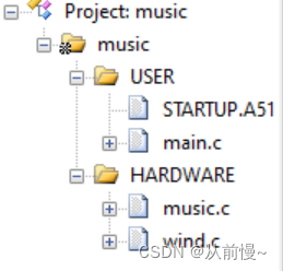 图中主要的程序文件为main.c、music.c和wind.c文件music.c文件里存放着我上部分讲解的乐理部分,而wind.c文件则存放着《起风了》这首歌的谱子。