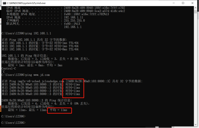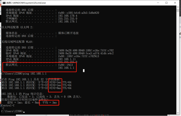 可以看到在无线网卡当中,网关是和我们地址在同一个网络,去ping一下,通过ping可以看一下往返时间。