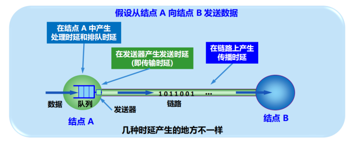哪种时延占据主导地位还得具体分析,比如计算机A访问美国的一个网站,要近过的链路非常多,每次经历一个路由器都得排队然后排队处理,每次经历过这些设备都需要经历这些时延。
