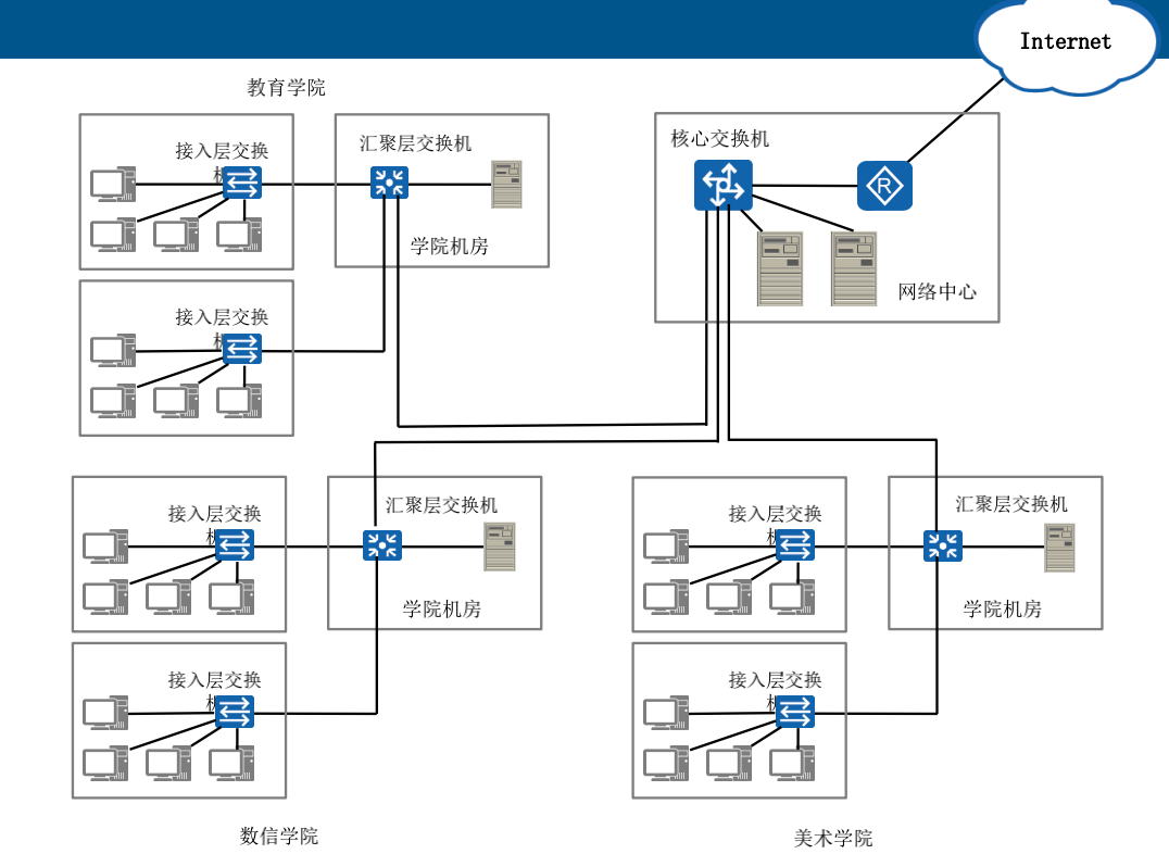 这是一个学校的网络,每间教室里面都有计算机,要连网想要在教室里面放入交换机设备,然后计算机接入到交换机上面,然后汇聚交换机将每个机房的交换机连接起来。
