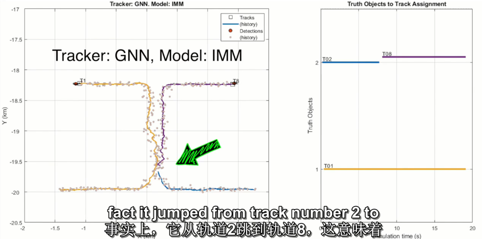 举例,两个独立物体分别移动,方向如图从下往上沿直线移动,中间路程很接近,。GNN算法表现:在稀疏时表现良好,当两物体接近时,GNN跟踪的轨道2丢失,并创建到轨道8才确认轨道。JPDA算法表现:一直维持两个独立轨道,虽然在两个物体接近时轨道有错误,且算法消耗大。