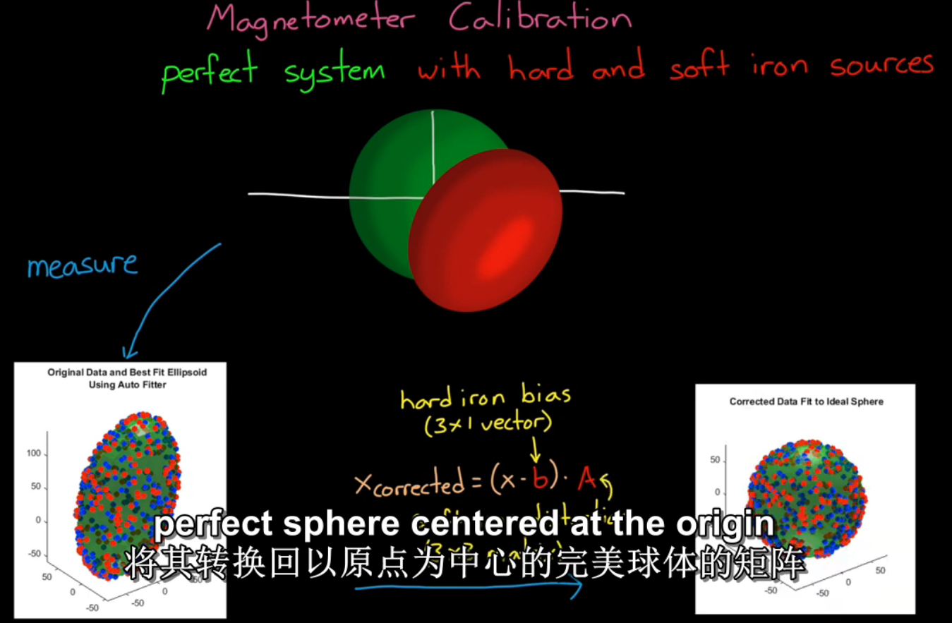 mag calibration校准系统的作用就是校准这些软硬磁体的影响。绿圆表示完美系统磁场,红圆表示在软硬磁体共同影响下的实际测量磁场。测量实际磁场,再结合系统原磁场数据,通过矩阵反变换,得到矫正过的mag,这样矫正过的mag测量的数据即为实际数据。