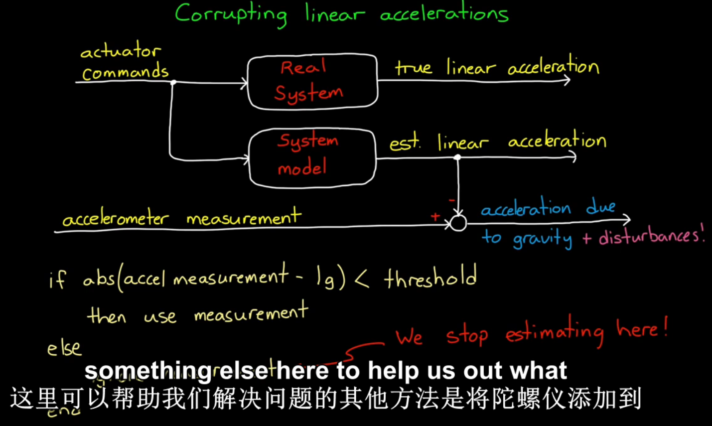 1、acc不止测量重力加速度,还对线性加速度敏感。对此问题的解决方法如图,当线性加速度是系统已知动作时,可用系统模型估计方法消除偏差;