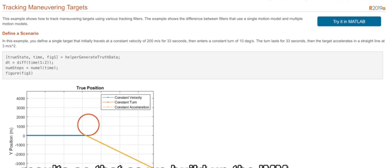 例8:使用IMM滤波器跟踪单个对象interacting multiple model filter。matlab传感器融合实例《pose estimation from asynchronous sensors》。如图是物体运动轨迹,分为3段共100s,200m/s直线匀速运动、10deg/s匀速转弯、3m/s^2之线加速度运动。本例证明多(本例3个)传感器滤波器IMM目标估计强于单个传感器滤波器。